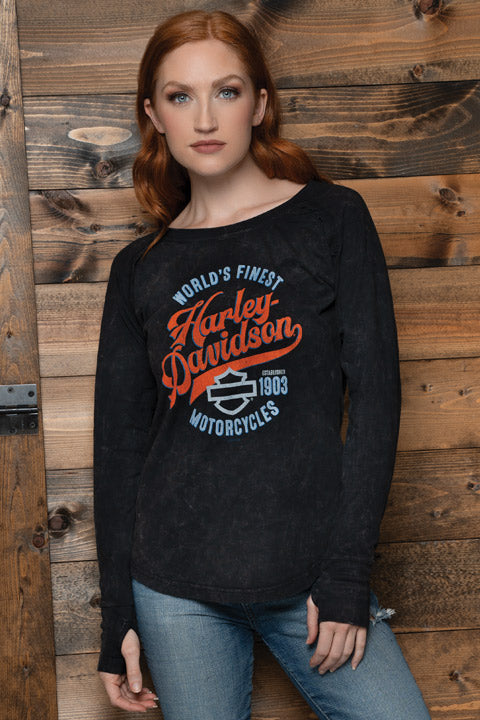 This long sleeve tee features Harley-Davidson graphics on the front with a Road and Sport™ Harley-Davidson® print on the back as well as thumbholes.