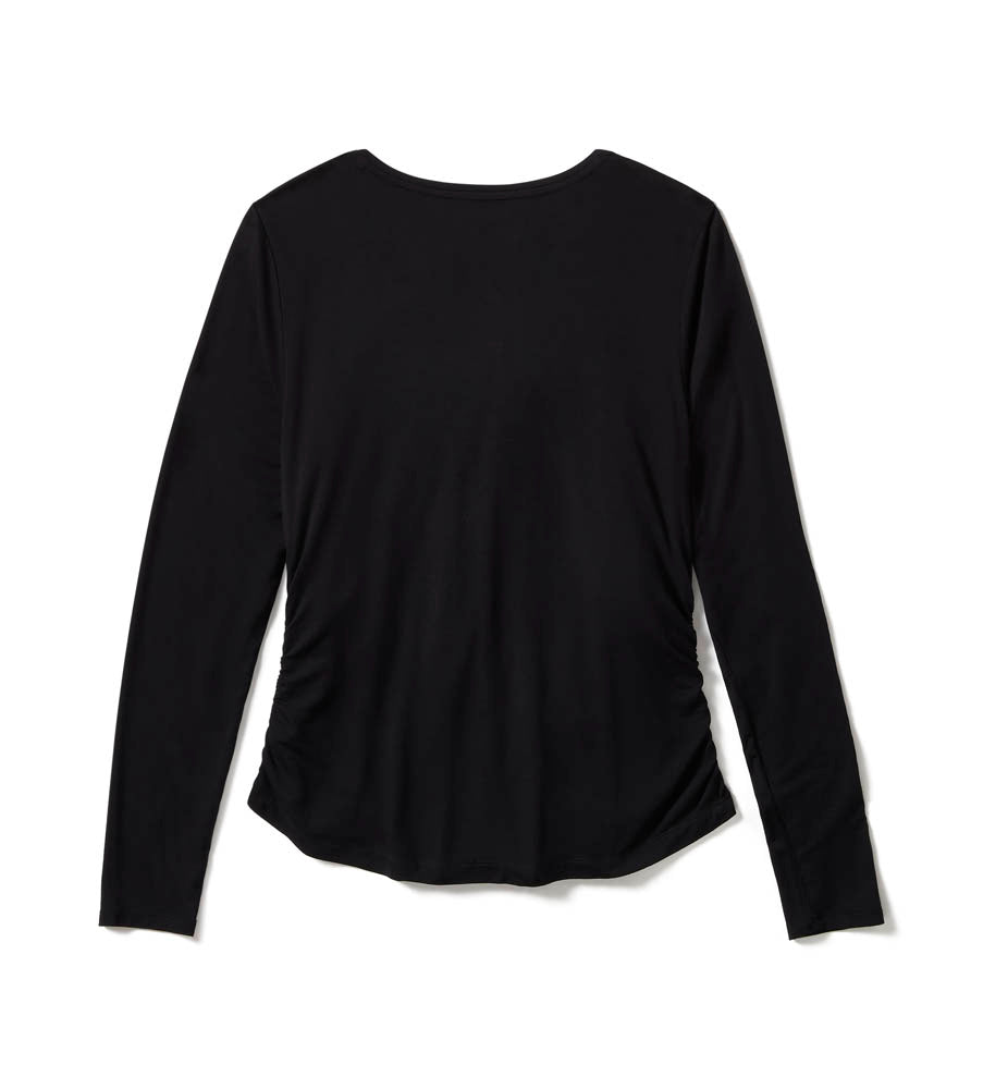 • Design Details: Slim fit. Self neck trim. Crew neckline. Side ruching. Shirttail hem.